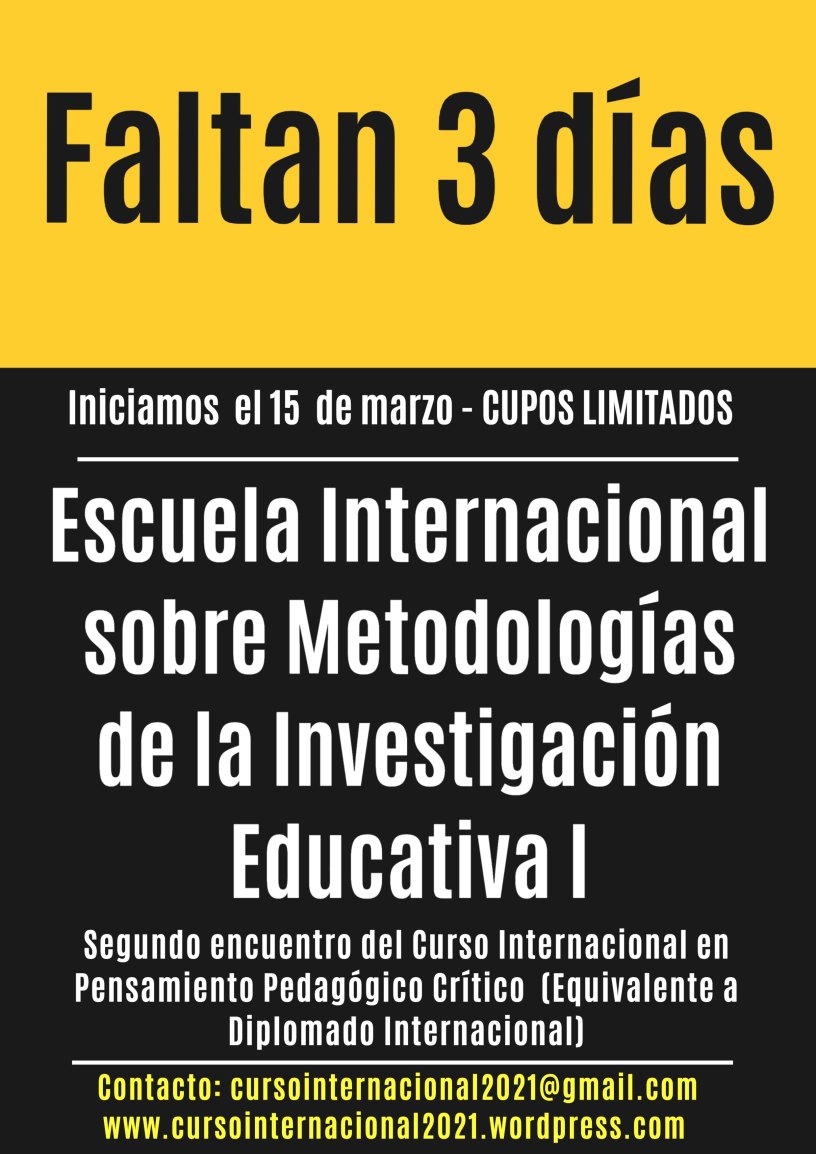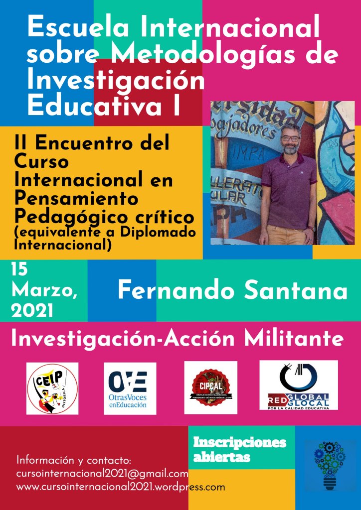 La Escuela Internacional sobre Metodologías de Investigación Educativa es el segundo módulo del Curso Internacional en Pensamiento Educativo Crítico. Podrán participar en la escuela les estudiantes del Curso Internacional en Pensamiento Educativo Crítico o quienes deseen formar parte solo de este evento.